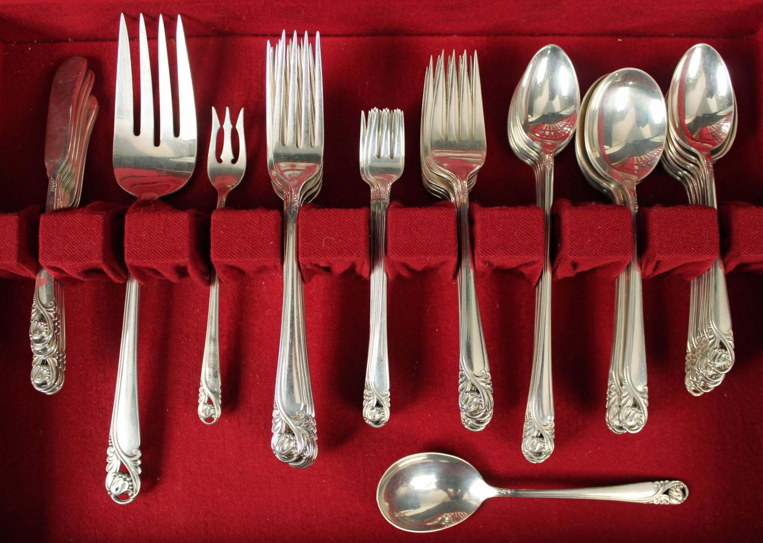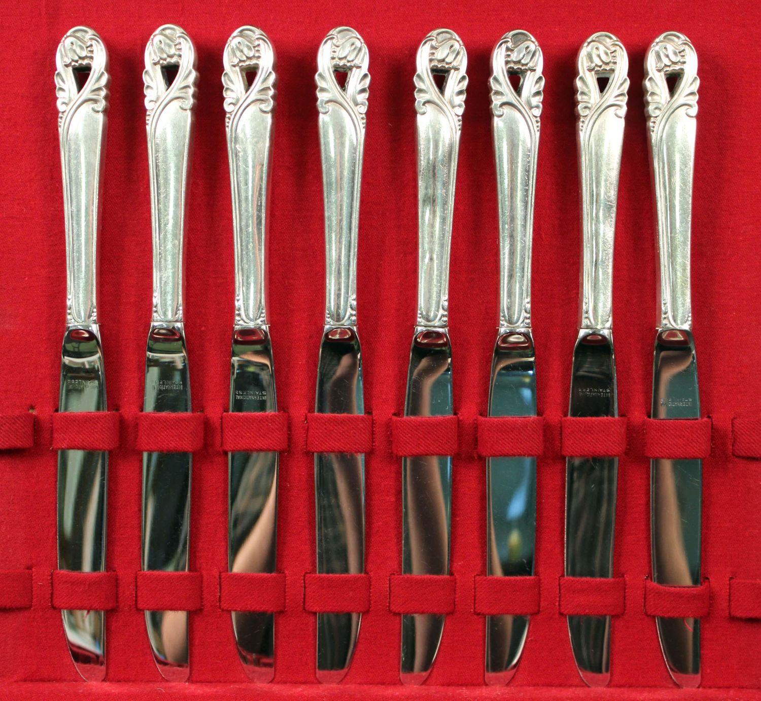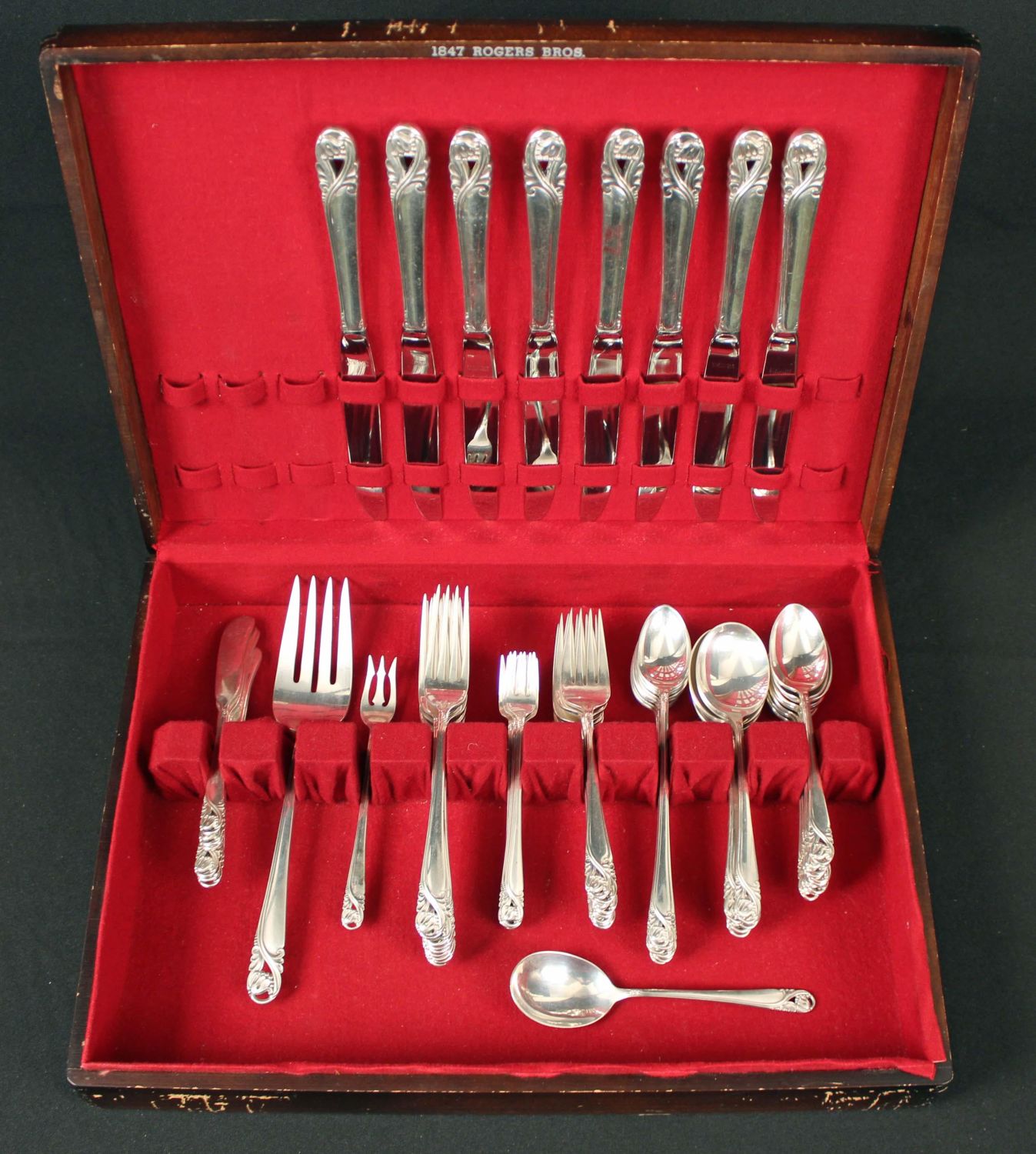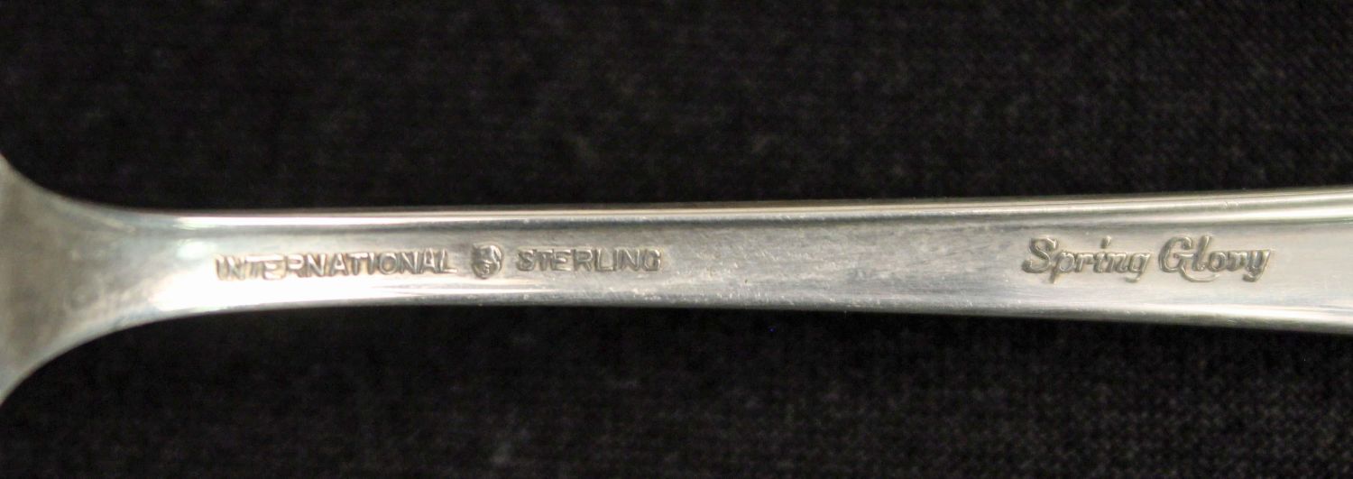 *WE WILL NOT ACCEPT CREDIT CARD AS PAYMENT FOR THIS LOT* International Spring Glory 62 Pcs. Sterling Silver Flatware Set. Set is housed in a 1847 Rogers Bros. case with a simulated mahogany finish. (8) Dinner knives. (8) Dinner forks. (8) Salad forks. (8) Teaspoons. (8) Ice tea spoons. (6) Soup spoons. (6) Solid butter knives. (1) Sugar shell. (7) Cocktail/seafood fork. (1) 9 1/8" large solid cold meat serving fork. (1) Short handle pickle/olive fork. Total weight is approx. 62.8ozt. Eight dinner knives were estimated at 1/2ozt. each. Condition- Flatware is in good condition with no monograms. Case has considerable amount of scratches to finish. See photos.