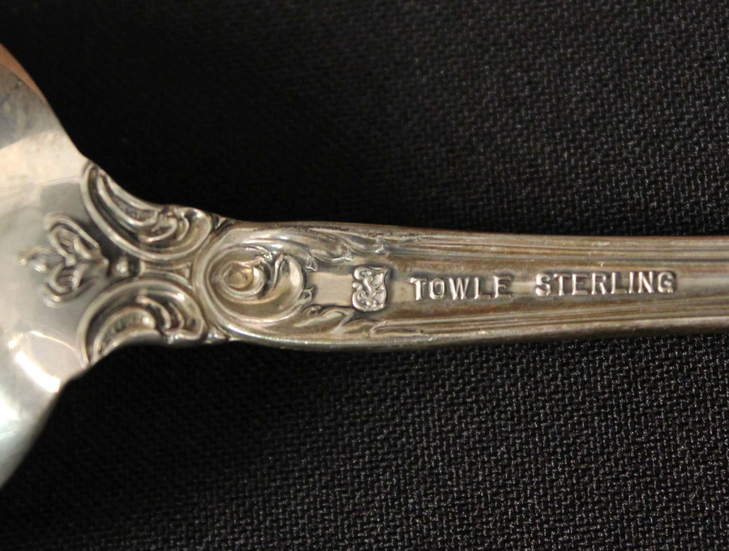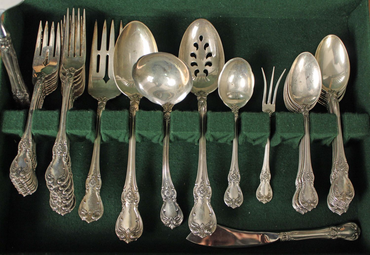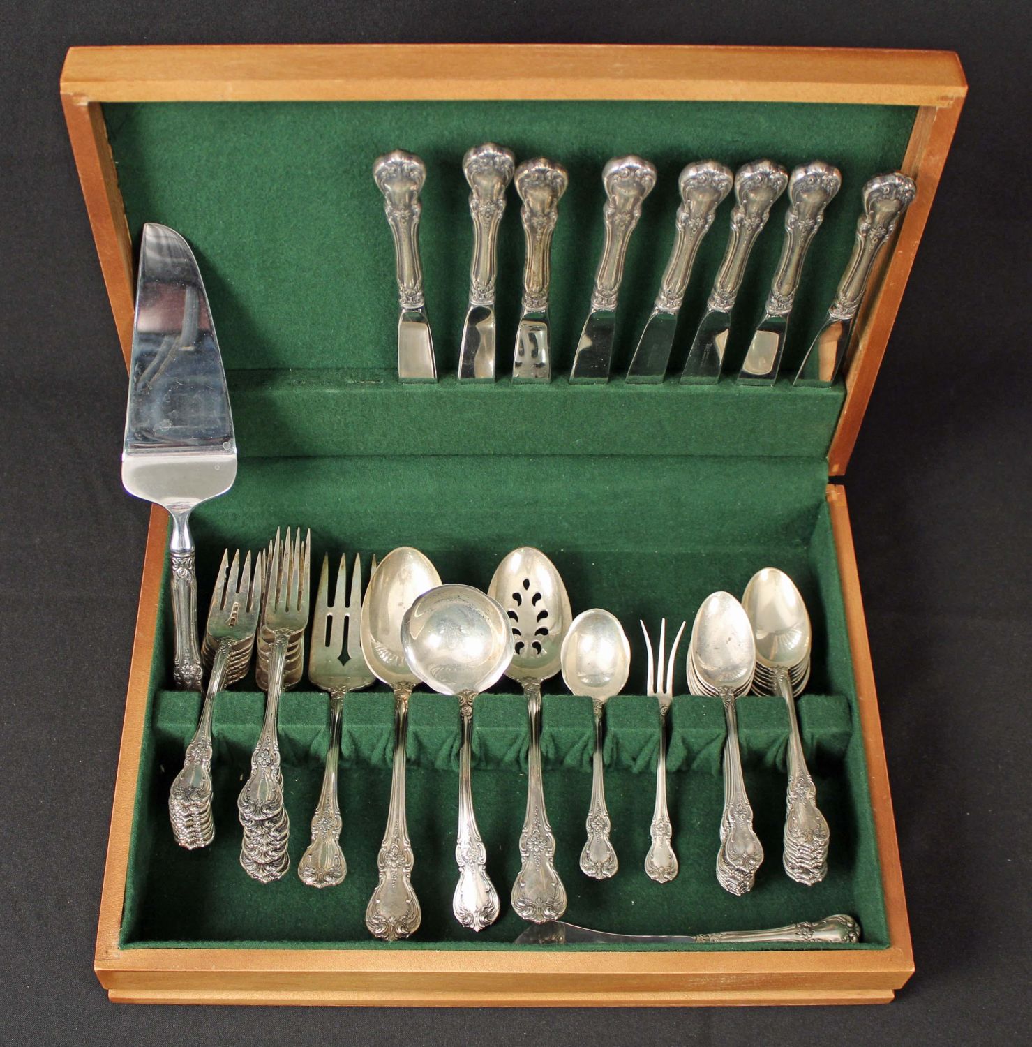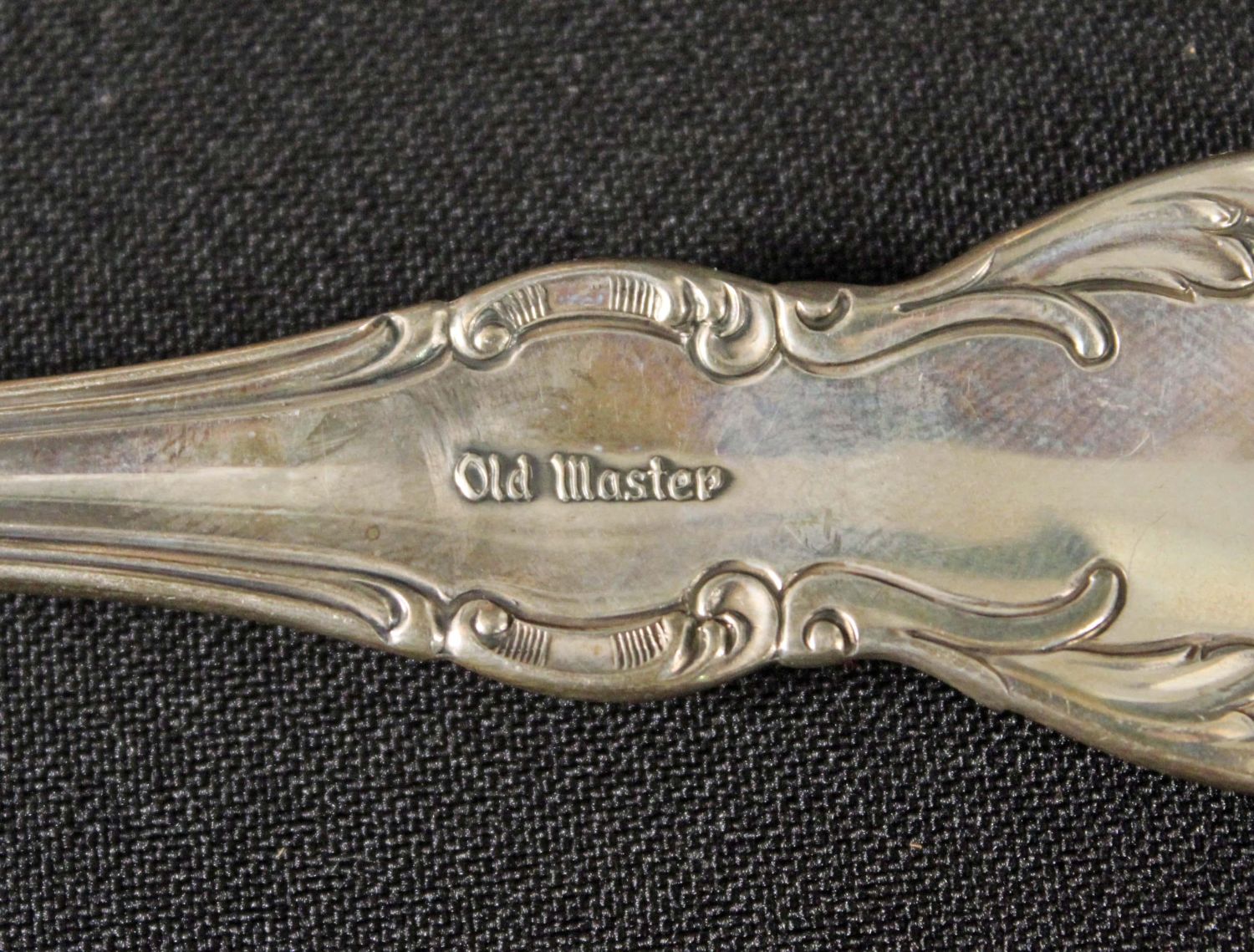 *WE WILL NOT ACCEPT CREDIT CARD AS PAYMENT FOR THIS LOT* (FLATWARE CASE DOES NOT GO WITH LOT. FOR DISPLAY ONLY) 47 Pcs. Towle Old Master Sterling Silver Flatware. (8) Salad forks. (8) Teaspoons. (8) Tablespoons. (8) 8 7/8" long modern hollow knives. (7) Dinner forks. (1) Sugar shell. (1) Master butter knife, 6 7/8" long. (1) Lemon fork. (1) 10 3/8" pie and cake server. (1) Medium solid cold meat serving fork. Measures 8 1/4" long. (1) Serving spoon, 8 1/2" long. (1) Pierced serving spoon, 8 1/2" long. (1) Solid gravy ladle, 6 3/4" long. The total weight is 54.29ozt. All the knives were estimated at 1/2" troy oz. each. This set is not monogrammed. Condition – (FLATWARE CASE DOES NOT GO WITH LOT. FOR DISPLAY ONLY) The set is in overall good condition with some wear and light tarnish. This set is not monogrammed. See photos.