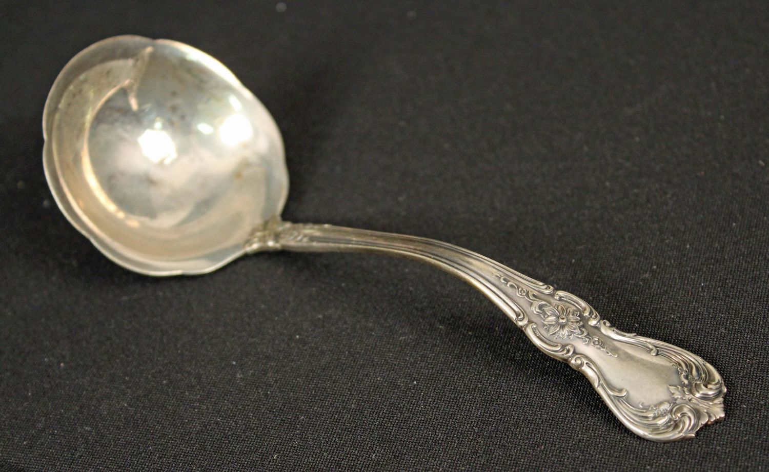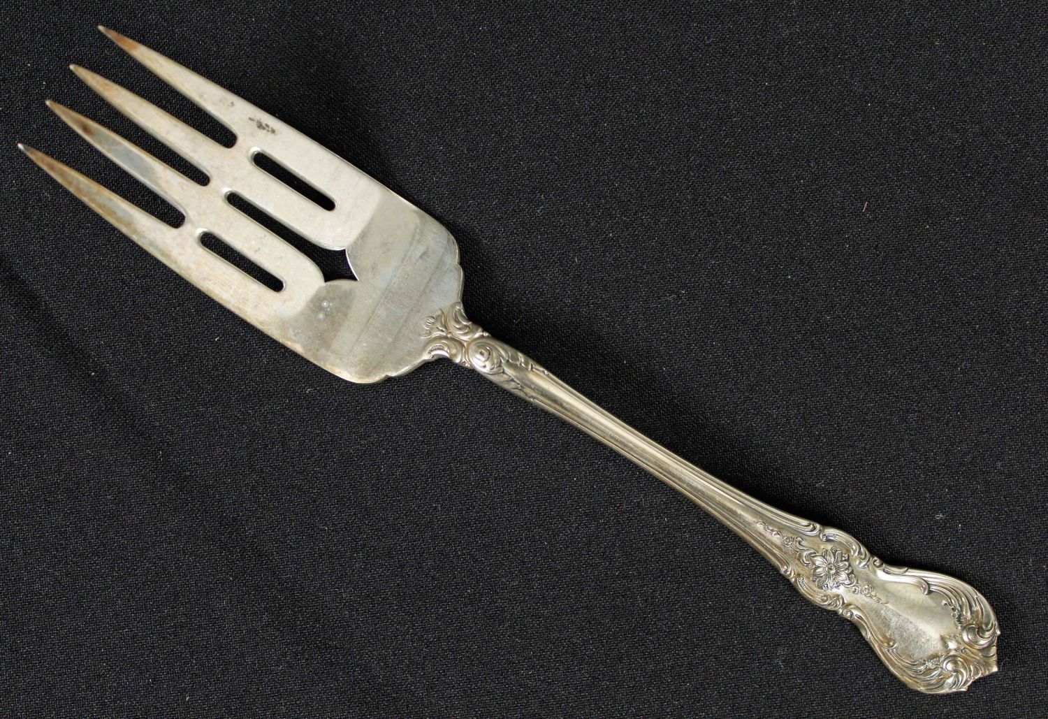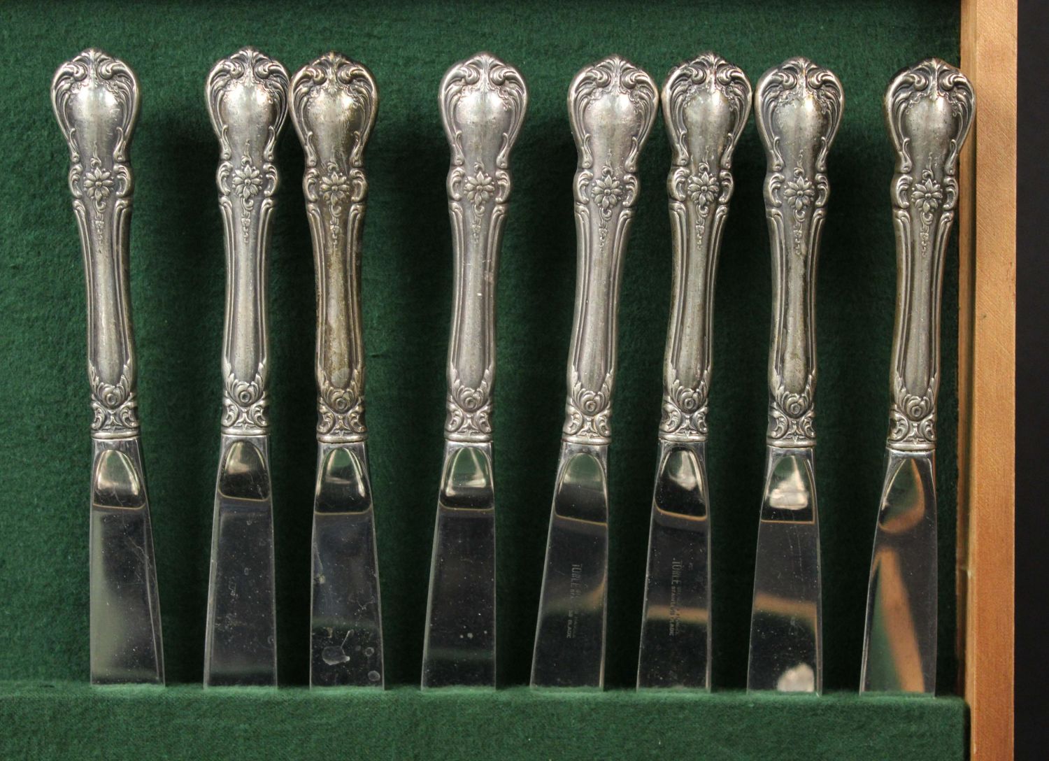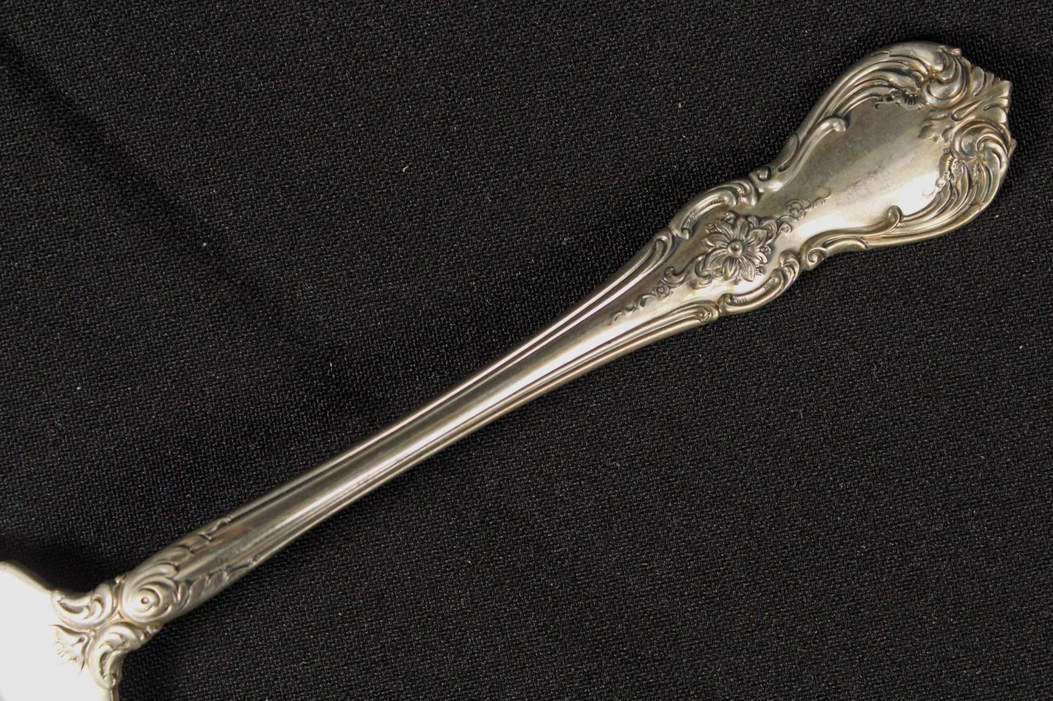 *WE WILL NOT ACCEPT CREDIT CARD AS PAYMENT FOR THIS LOT* (FLATWARE CASE DOES NOT GO WITH LOT. FOR DISPLAY ONLY) 47 Pcs. Towle Old Master Sterling Silver Flatware. (8) Salad forks. (8) Teaspoons. (8) Tablespoons. (8) 8 7/8" long modern hollow knives. (7) Dinner forks. (1) Sugar shell. (1) Master butter knife, 6 7/8" long. (1) Lemon fork. (1) 10 3/8" pie and cake server. (1) Medium solid cold meat serving fork. Measures 8 1/4" long. (1) Serving spoon, 8 1/2" long. (1) Pierced serving spoon, 8 1/2" long. (1) Solid gravy ladle, 6 3/4" long. The total weight is 54.29ozt. All the knives were estimated at 1/2" troy oz. each. This set is not monogrammed. Condition – (FLATWARE CASE DOES NOT GO WITH LOT. FOR DISPLAY ONLY) The set is in overall good condition with some wear and light tarnish. This set is not monogrammed. See photos.