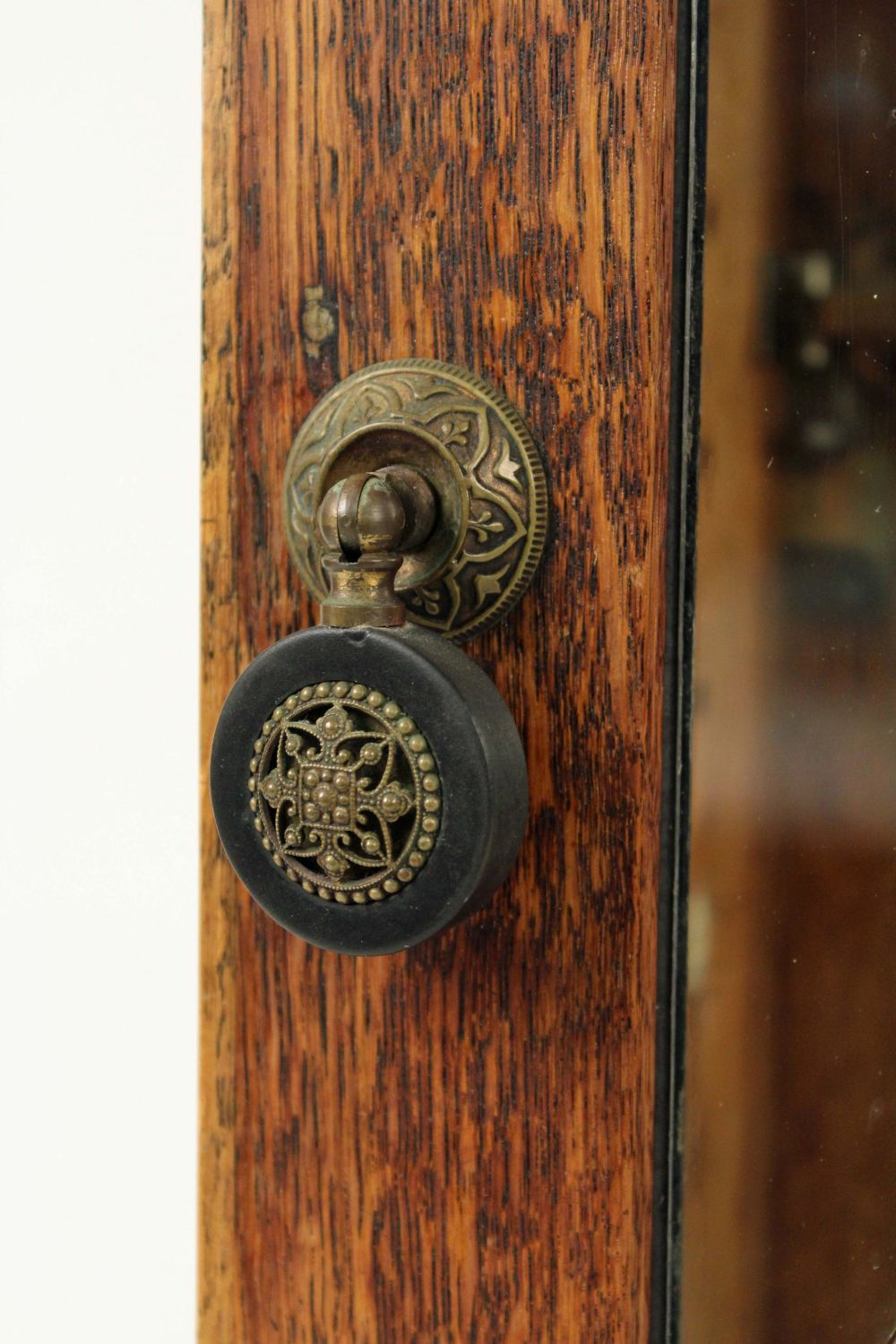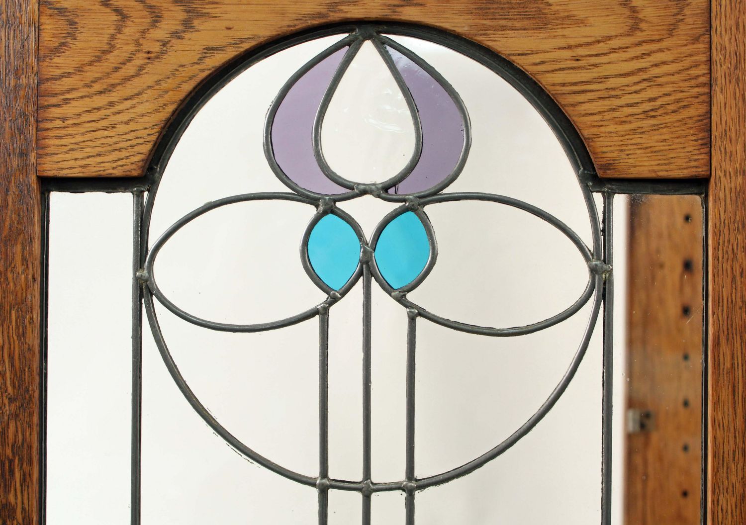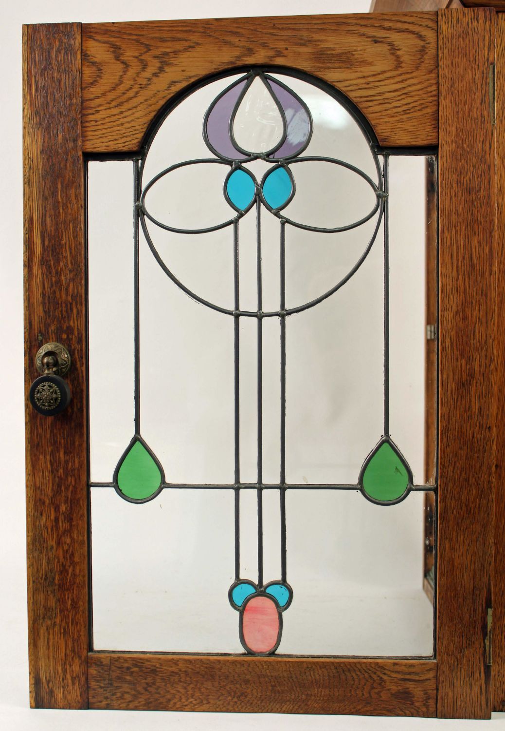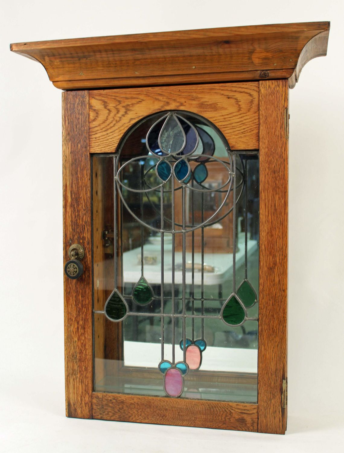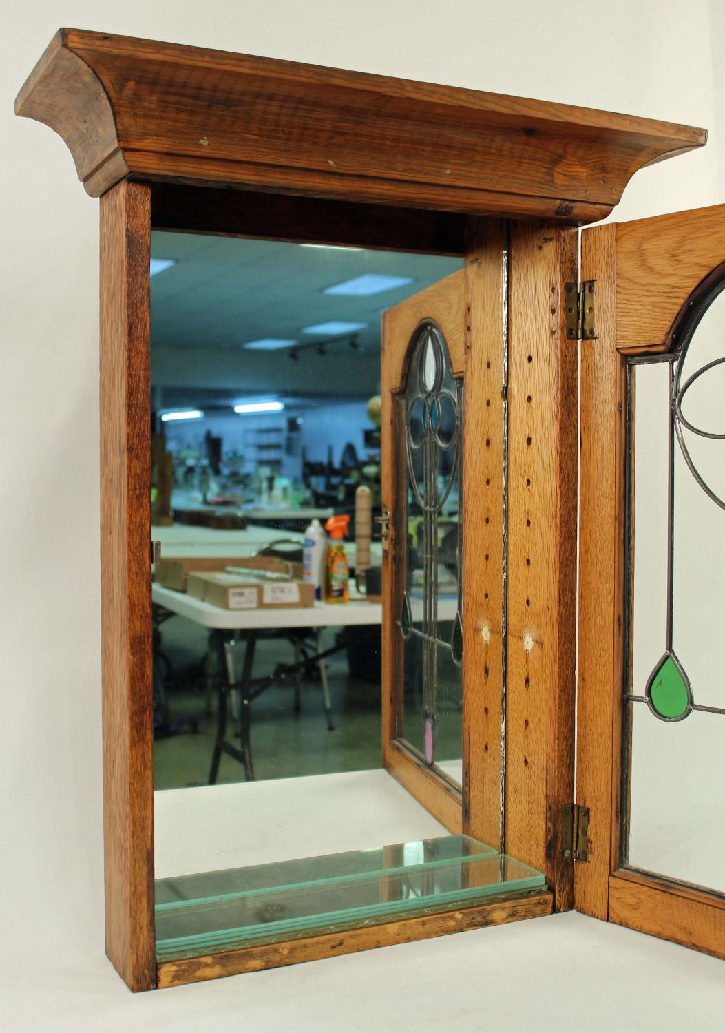 Oak and Pine Medicine Cabinet with Stained Glass Door. The cabinet has glass shelves and a mirrored back. Measures 28" H. X 22" W. X 7 3/8" D. Condition – The cabinet is in overall good condition with some old repairs. The shelf support brackets are not included and must be purchased separately.