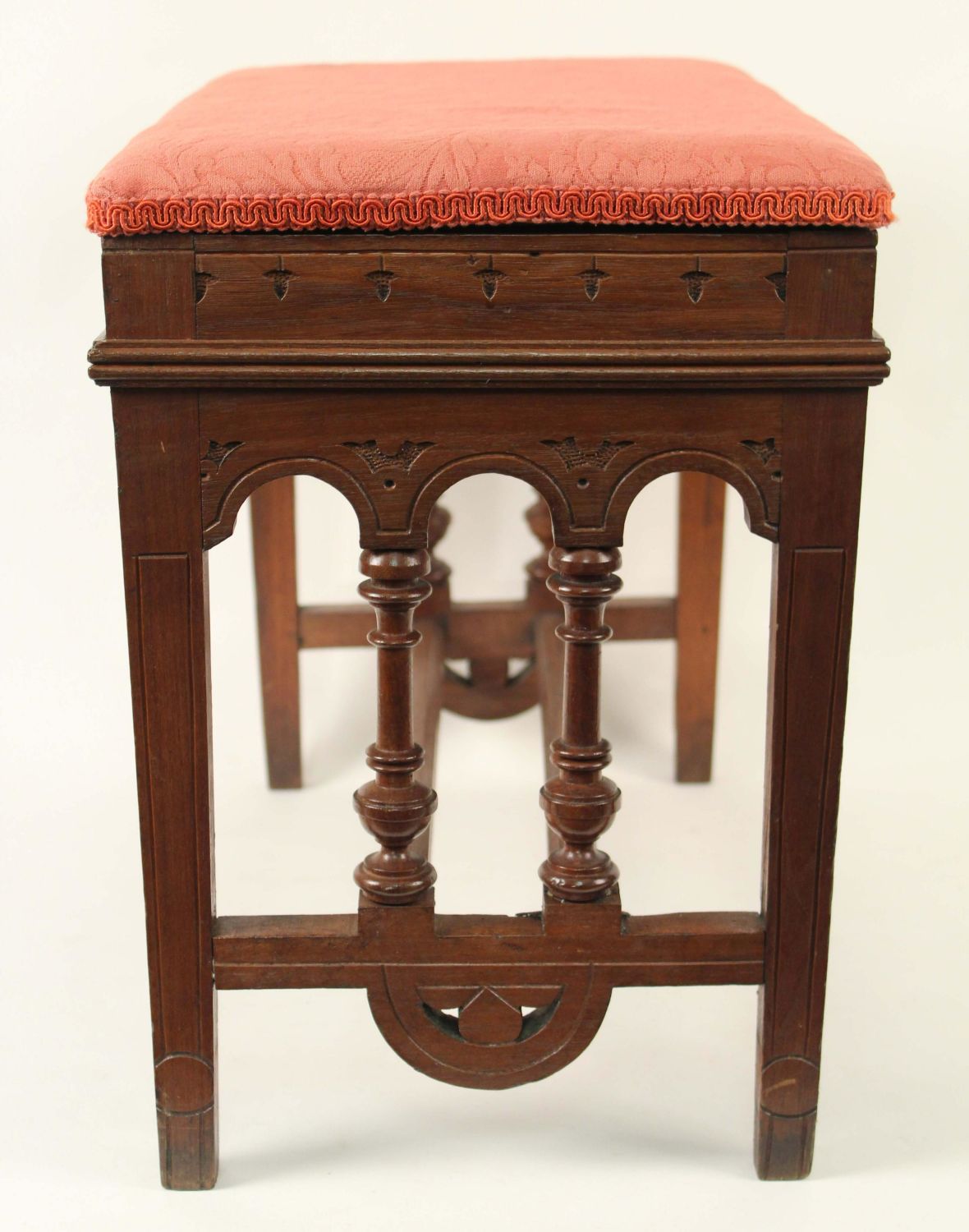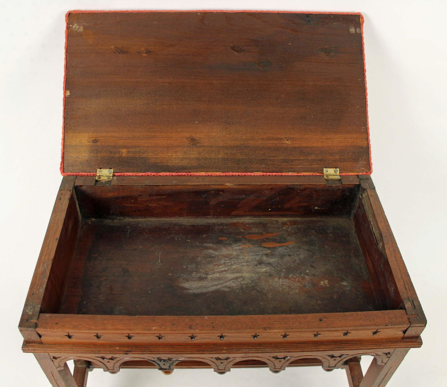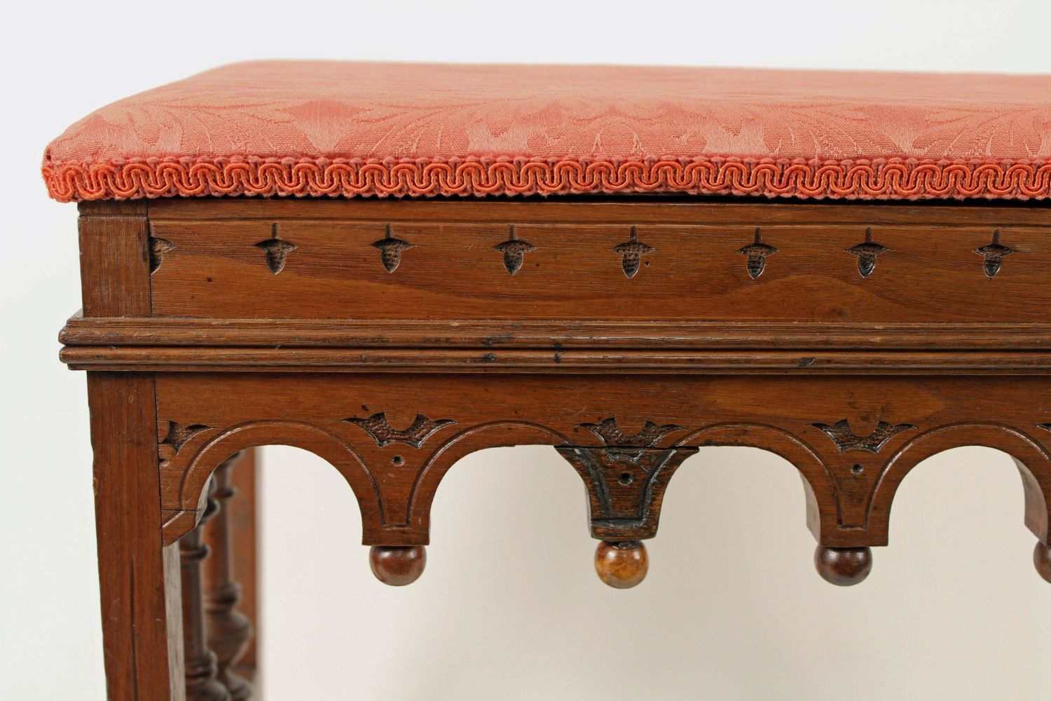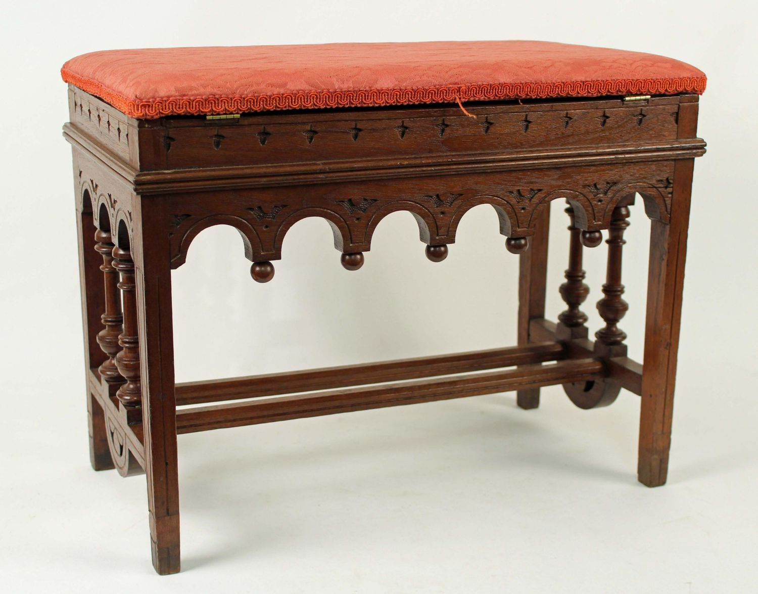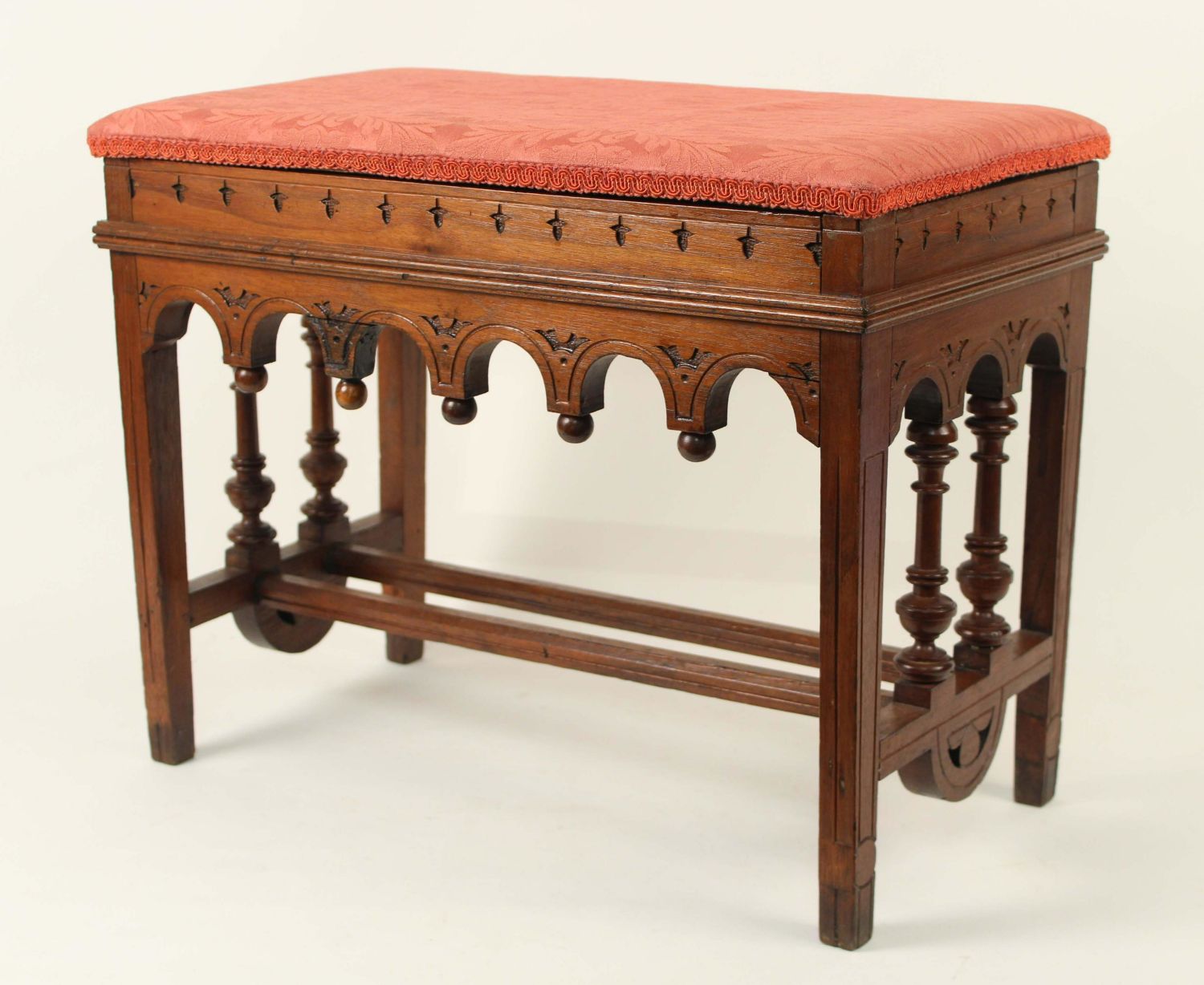 19th C. Gothic Walnut Lift-Top Stool. Measures 16" H. X 11 1/4" X 20" Long. Condition – Good condition with some old repairs.