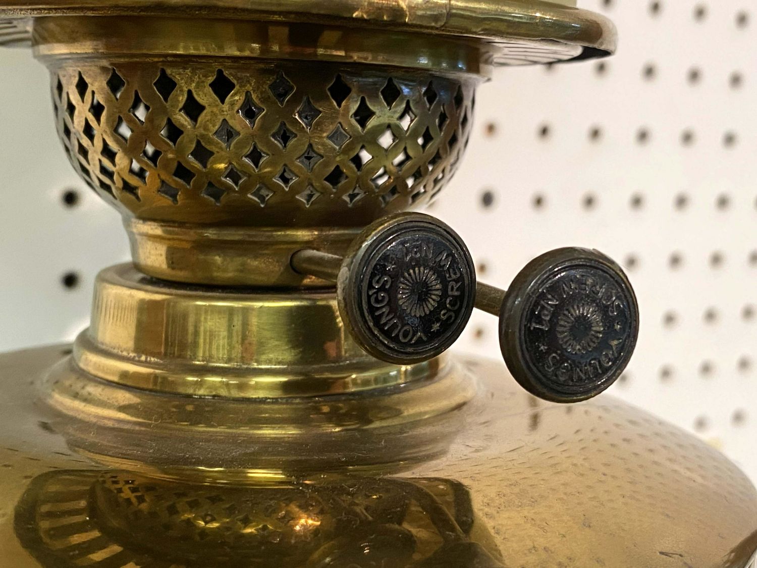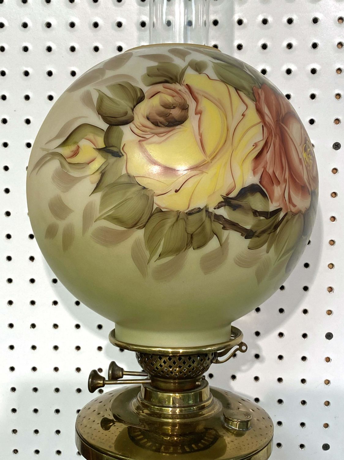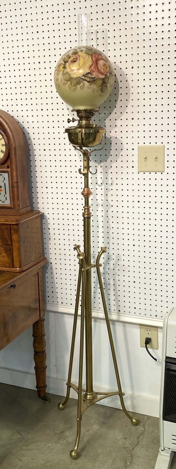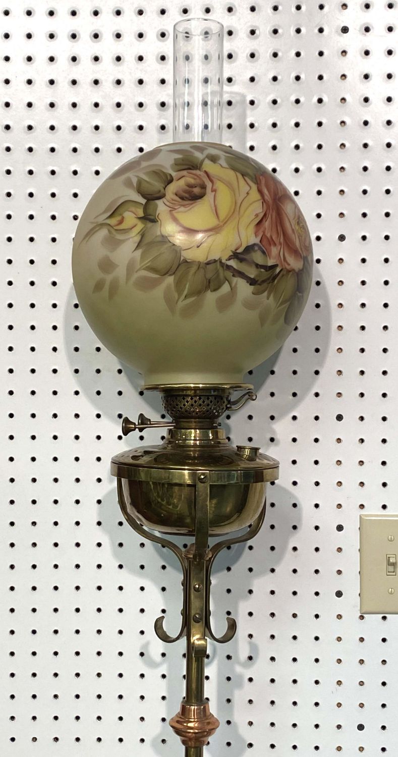 Young’s Brass Screw 19th Century No. 1 Piano Lamp. The lamp has a hand painted ball shade with roses. Measures 72" high. Condition- The lamp has never converted to electricity, brass has older polish. Good condition. See photos.