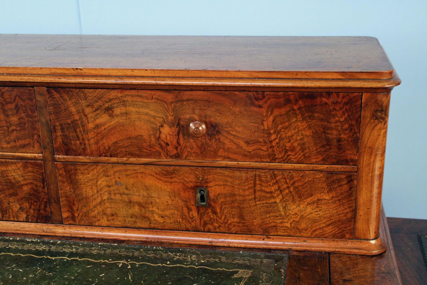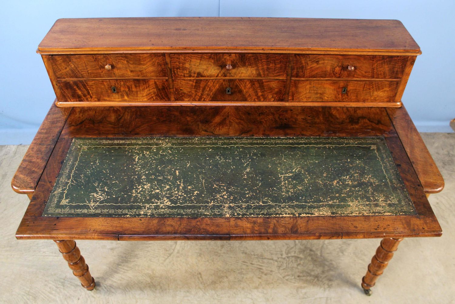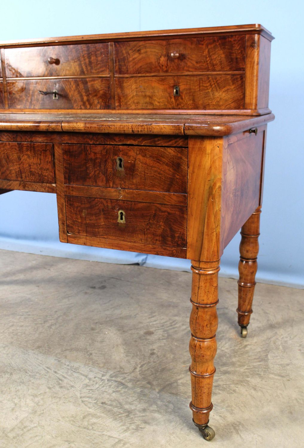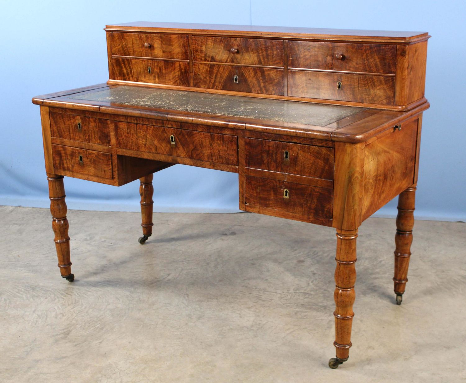 19th C. English Mahogany Office Desk. The desk has 11 drawers, a pullout writing area with tooled leather top, and two pullout witting areas on both ends with tooled leather tops. Measures 40 1/4" high x 53" long x 26" deep. Condition- The piece is in overall good condition with wear to leather top. See photos.