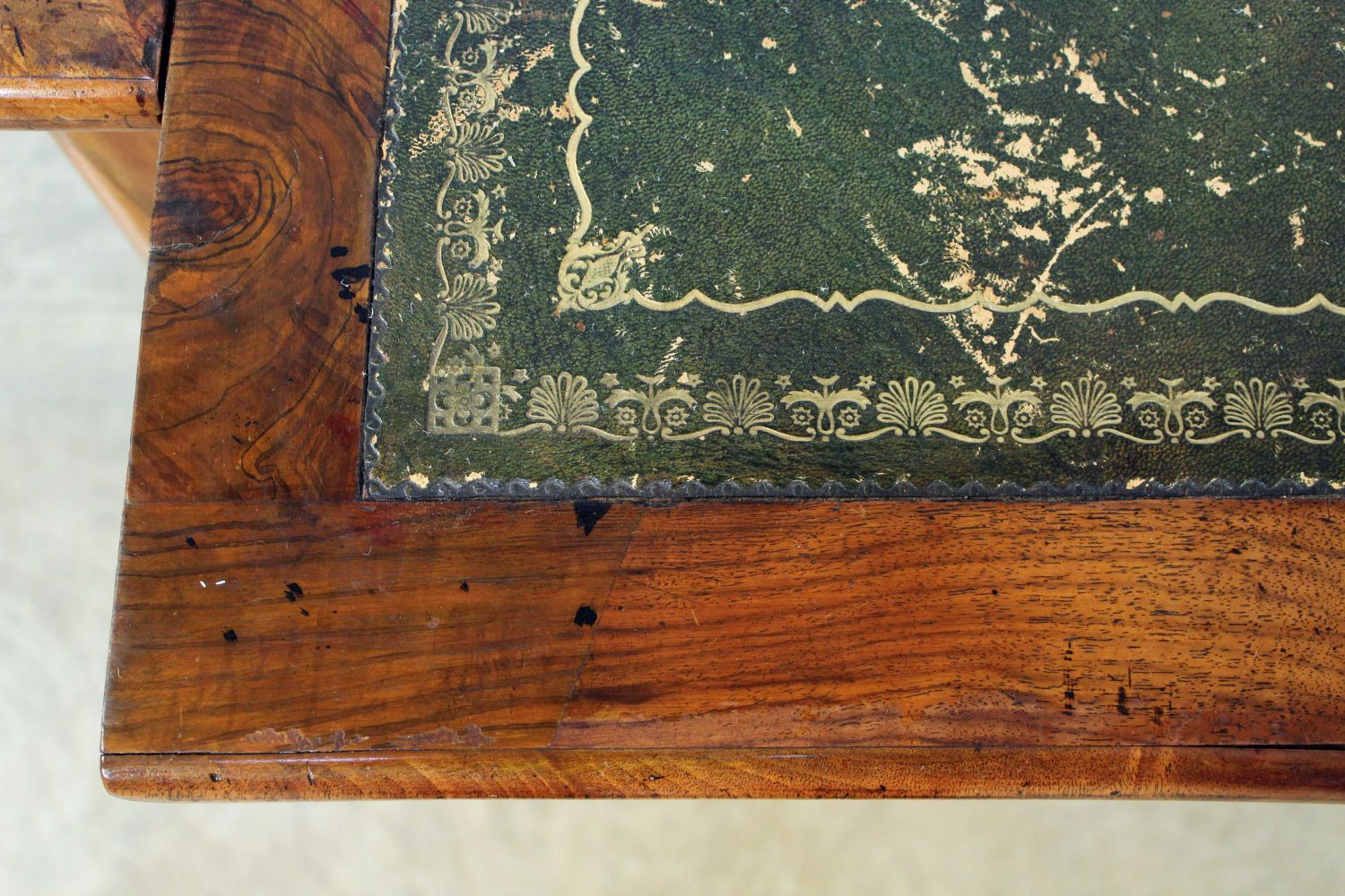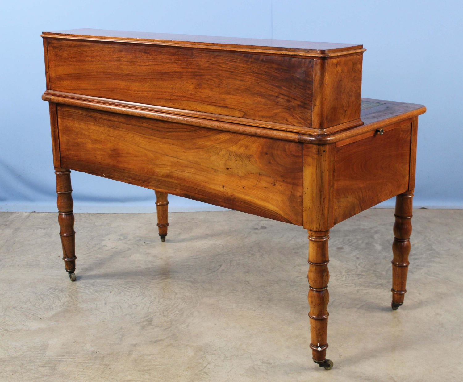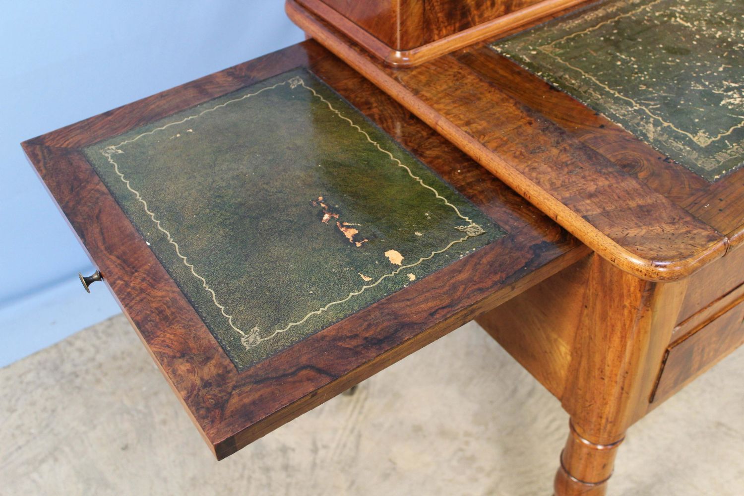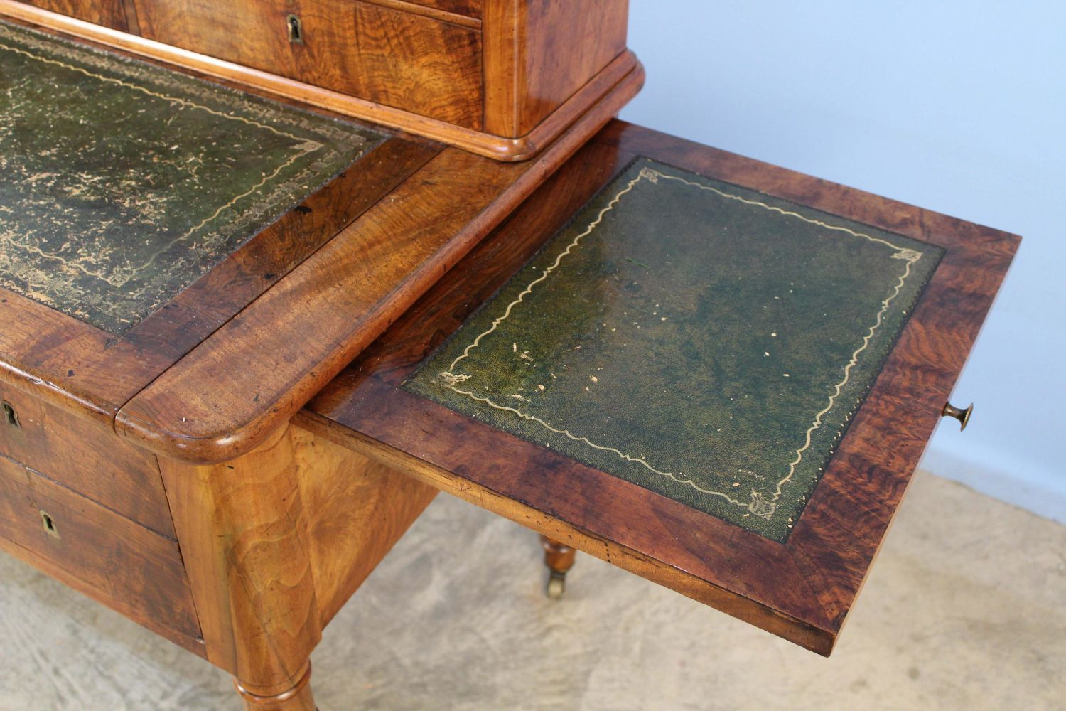 19th C. English Mahogany Office Desk. The desk has 11 drawers, a pullout writing area with tooled leather top, and two pullout witting areas on both ends with tooled leather tops. Measures 40 1/4" high x 53" long x 26" deep. Condition- The piece is in overall good condition with wear to leather top. See photos.